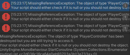1. 플레이어 파괴후 재생성 후에 장애물과 부딪혔더니, 플레이어 오브젝트가 파괴되어 코루틴을 실행할 수 없다는