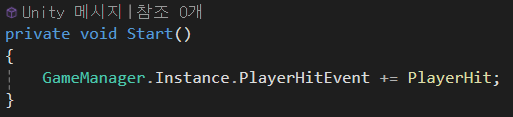 또한, 플레이어 컨트롤러 스크립트에서 PlayerHitEvent에 PlayerHit 함수를 구독시켜,