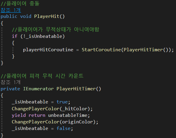 또한 PlayerHitCorutine은 실행될때마다 새롭게 할당을 하기 때문에 이해가 가지않았다.