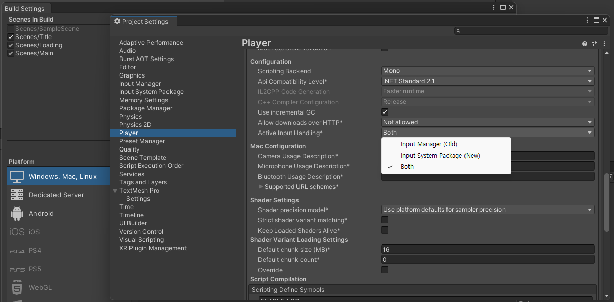 Project -> Player -> OtherSetting -> Configuration -> Active Input Handling을 InputManager로 했었는데.