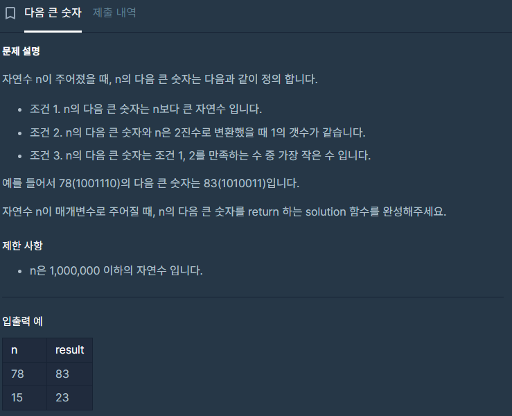 4. n보다 크고 동일한 1의 갯수를 가진 2진수를 10진수 형태로 반환합니다.