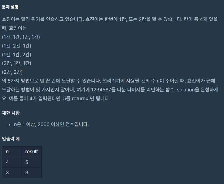 효진이는 1,2 칸씩 뛸 수 있습니다. 효진이가 멀리뛰기에 사용할 칸의 수 n일 때,