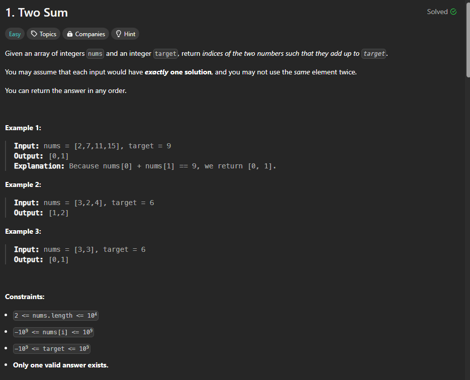 특히 complement를 이끌어내는 공식인 target - nums[i]를 활용해볼 생각 또한 하지 못했다.