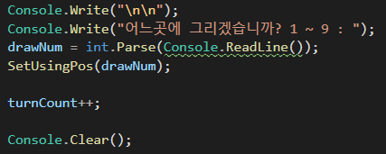 Console.Write("어느곳에 그리겠습니까? 1 ~ 9 : ");