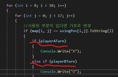 for문을 돌다가 usingPos 좌표안에 들어있는 플레이어의 입력값(1~9)을 만나 O,X로 그리게 구현하였습니다.