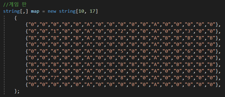 게임판을 특정 문자가 들어간 2차원 배열로 설정하였고. 판의 크기만큼 for문을 돌려 맵을 그렸습니다.