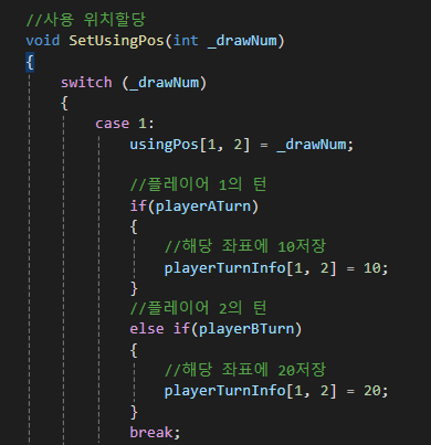 SetUsingPos() 함수를 수정해 해당 좌표의 정보값에 p1의 턴이면 10, p2의 턴이면 20을 저장하게 설정해 해결했습니다.