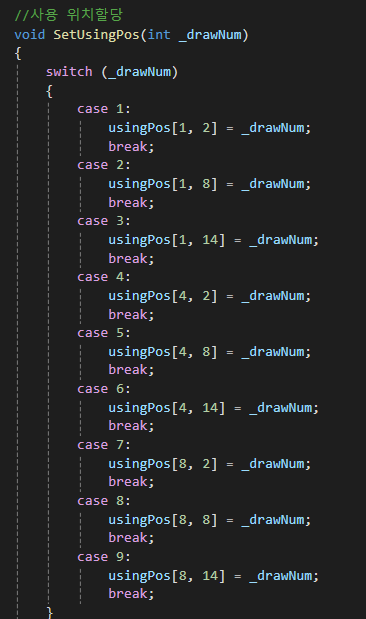 해당 번호(1~9)가 있는 좌표값 = usingPos에 drawNum을 넘겨주게 됩니다.