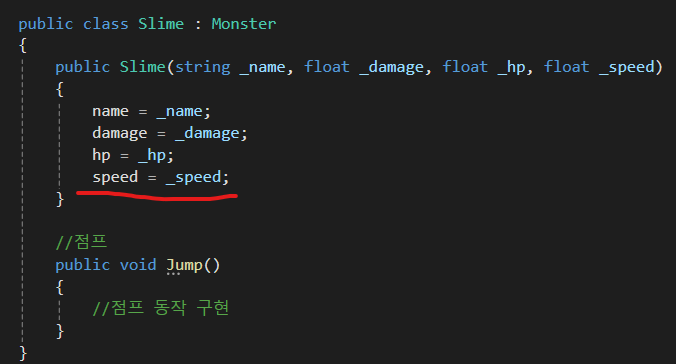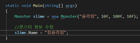 접근제한자를 붙여 위와 같이 slime이라는 객체의 값을 정해줄 수 있습니다.