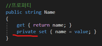 이런식으로 만들어진 프로퍼티 Name을 활용하면 간접적으로 변수 name에 접근 할 수 있게 됩니다.