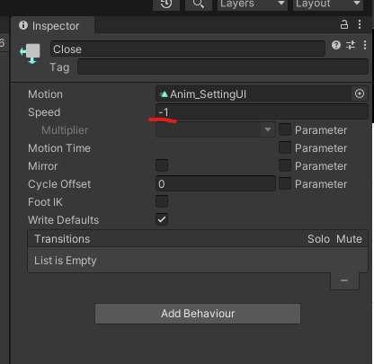Animator에 연결된 애니메이션의 speed값을 -값, 즉 음수 값으로 지정하면 해당 애니메이션을
