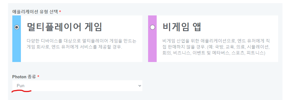 1. 포톤 홈페이지에서 로그인 후 새 애플리케이션을 생성을 누른 뒤 Photon 종류를 Pun으로 설정합니다.