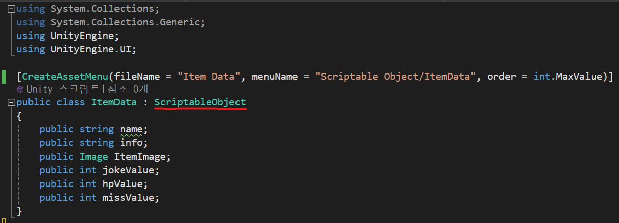 2. 스크립터블 오브젝트에 정의할 데이터들을 상속받은 클래스 안에 작성합니다.