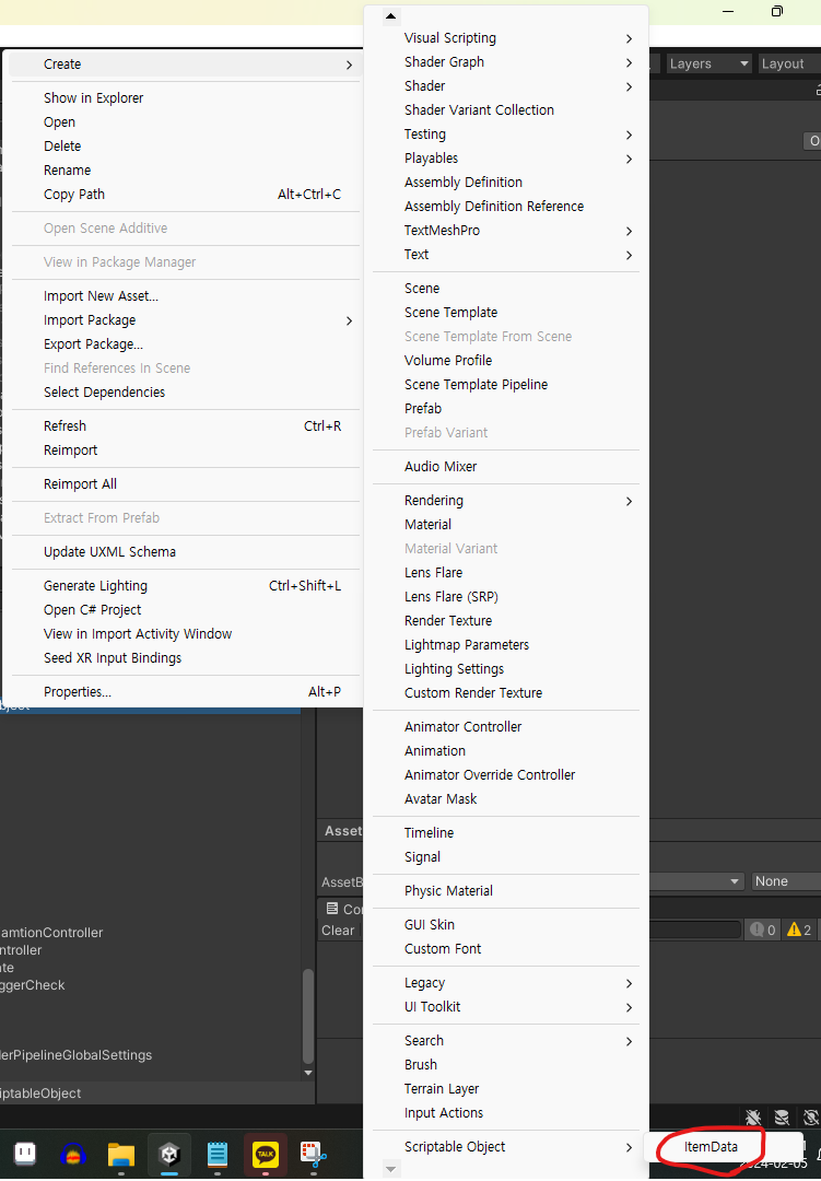 ScriptableObject를 상속 받은 클래스는 에셋메뉴에서 생성할 수 있게