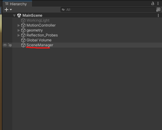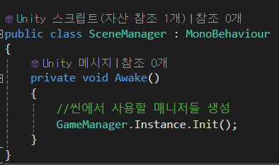 하이어라키에 씬 매니저 하나만 올려두고, 씬매니저의 스크립트를 통해 싱글톤 베이스에서 작성해둔 Init 함수를 호출해서