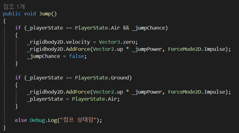 따라서, 2번째 점프를 하는 시점에 Velocity를 0으로 초기화 해주는 코드를 한줄 추가하여 구현하였다.