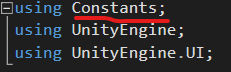 아래 처럼, 새로운 nameSpace인 Constants를 만들어 게임내에서 여러곳에서 참조되고, 쉽게 변하지 않는 데이터들을 묶어 놓자.